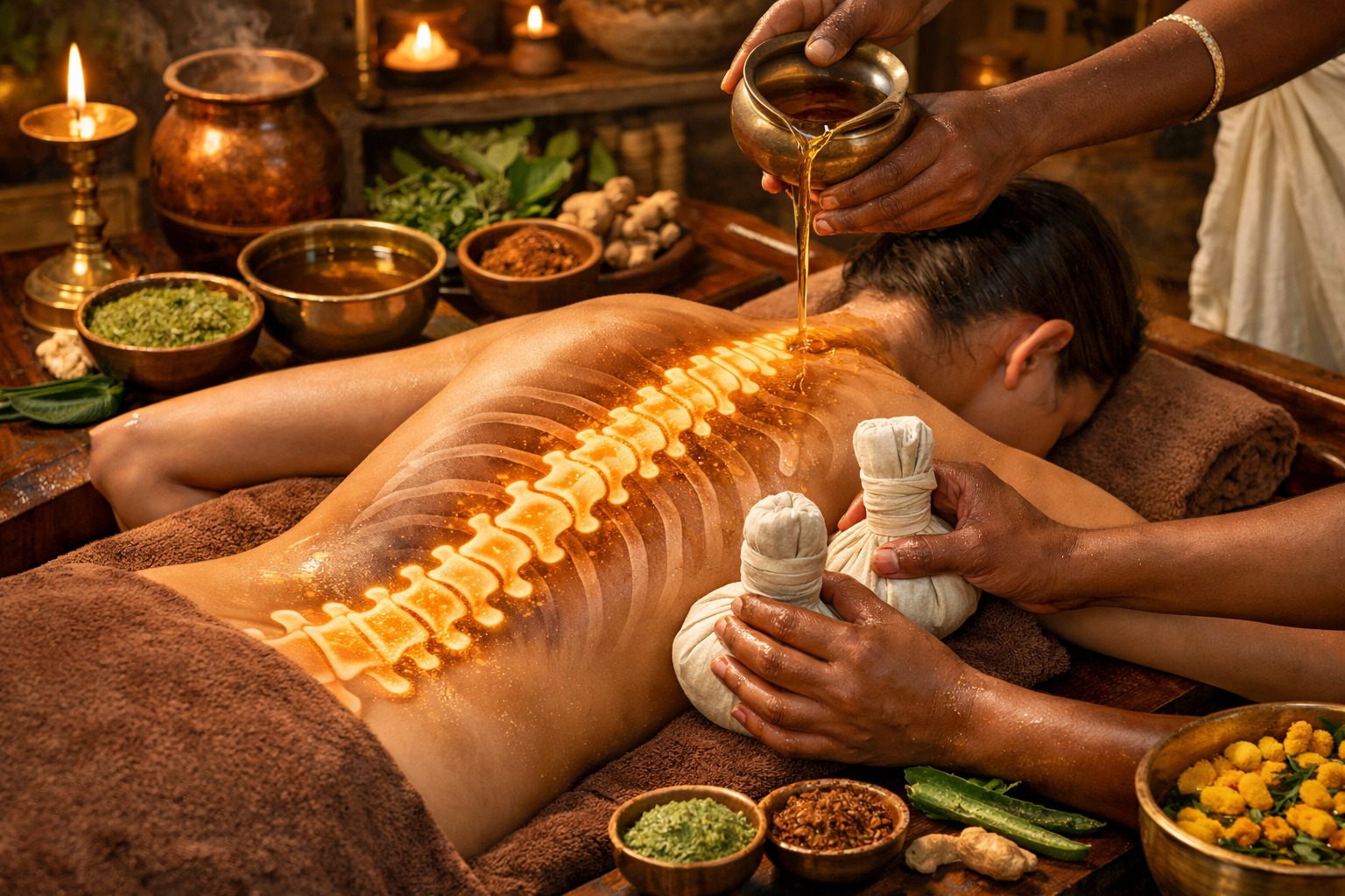 Once the underlying imbalance is identified, internal detoxification therapies are initiated to remove toxins (Ama) and pacify aggravated Vata dosha. Medicated internal therapies and purification procedures help reduce stiffness, inflammation, dryness, and nerve irritation while improving digestion and circulation. Balancing Vata is essential in spine disorders, as it restores lubrication to joints, calms nerve sensitivity, and creates a stable internal environment for long-term spinal healing.